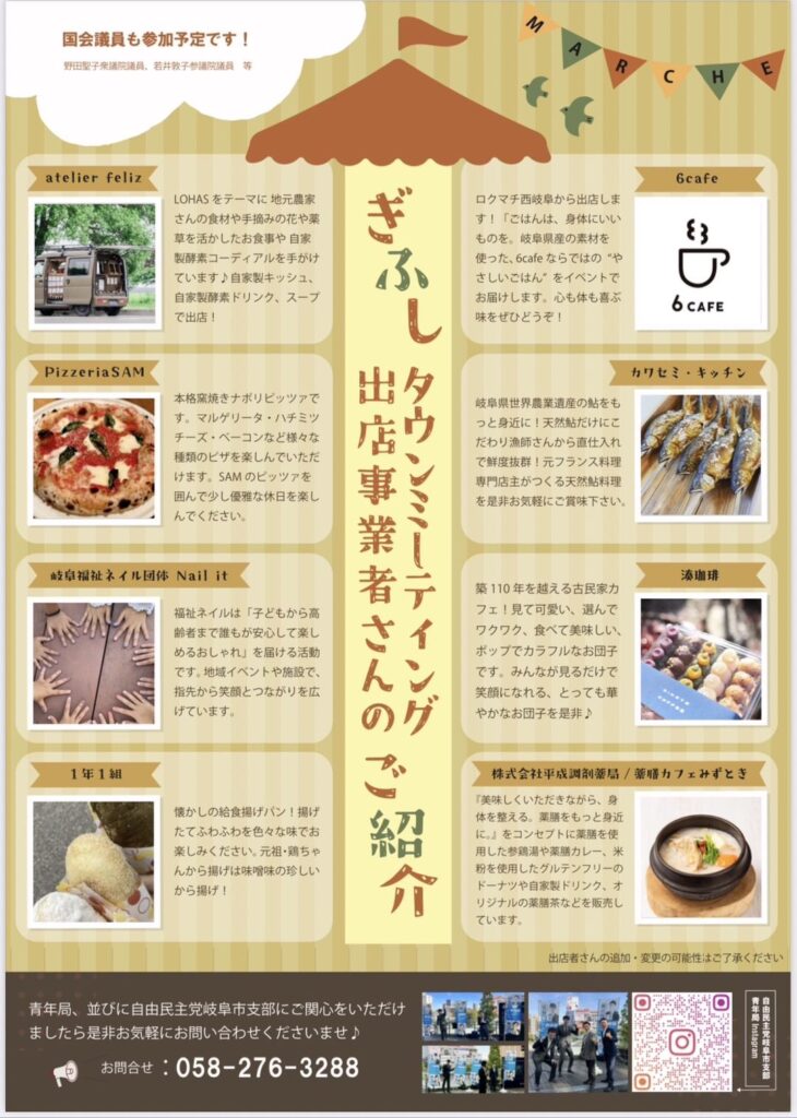 岐阜の美味しいグルメ等の出店(詳細は画像をご覧ください!)を楽しみながら、まるでピクニックのように、私たち青年局メンバーや議員の皆さんと「政治や普段の生活のこと」といった身近な課題について意見を交わせる場を作りたいと考えています。