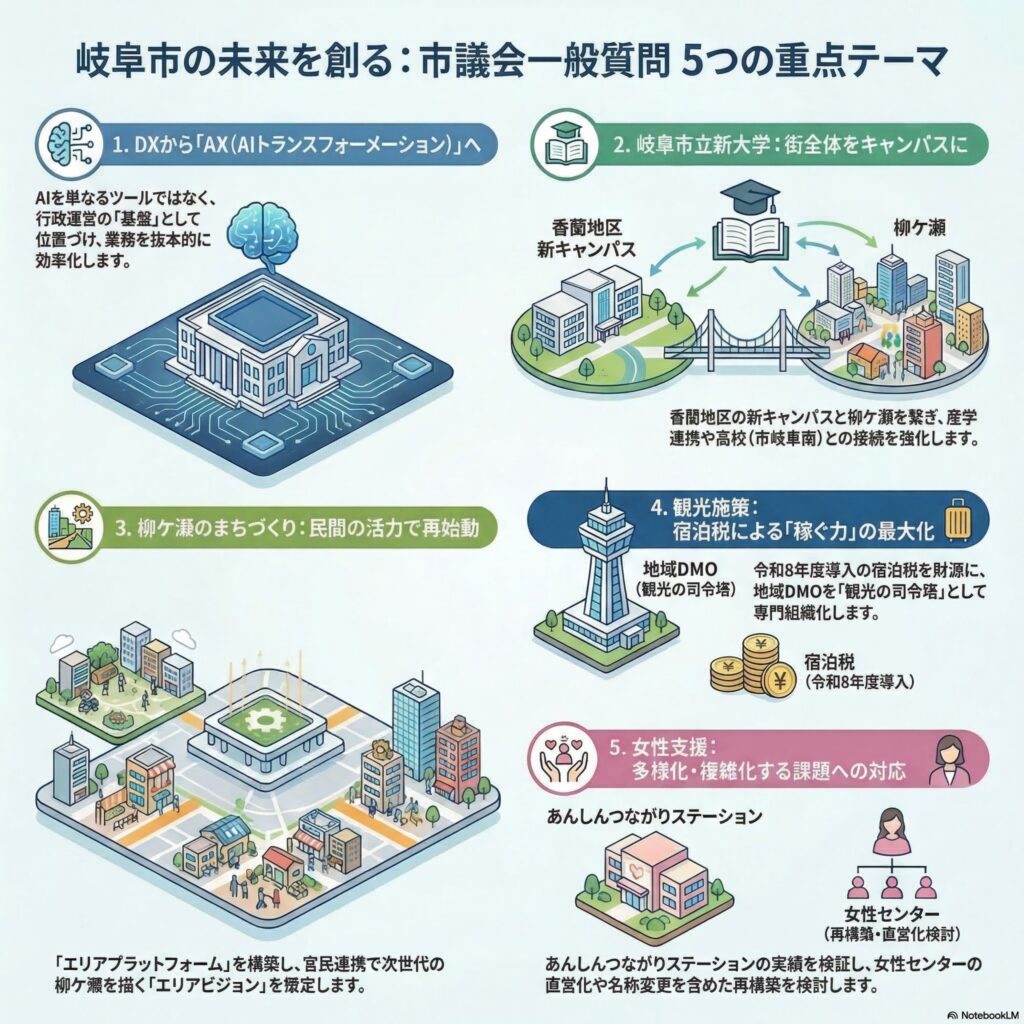 今回の質問内容は、DX(デジタル化)の推進から、新大学の設置、柳ケ瀬の活性化、観光、そして女性支援まで、これからの岐阜市の形をつくる重要な5項目です。