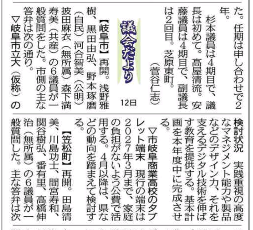 今回は柳ケ瀬の活性化についてはアーケード撤去に係る進捗やエリアプラットフォーム構築。教育についてはタブレット端末の更新等、未来を見据えた質問や提案をしました。これからも真剣に市政と向き合っていきます。