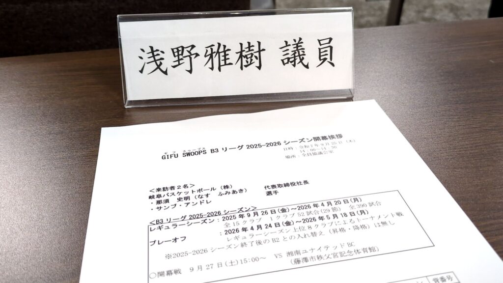 議会閉会後、スポーツ議員連盟の会合にて、バスケB3リーグ岐阜スゥープスの那須社長から、シーズン開幕前の挨拶を頂きました。
